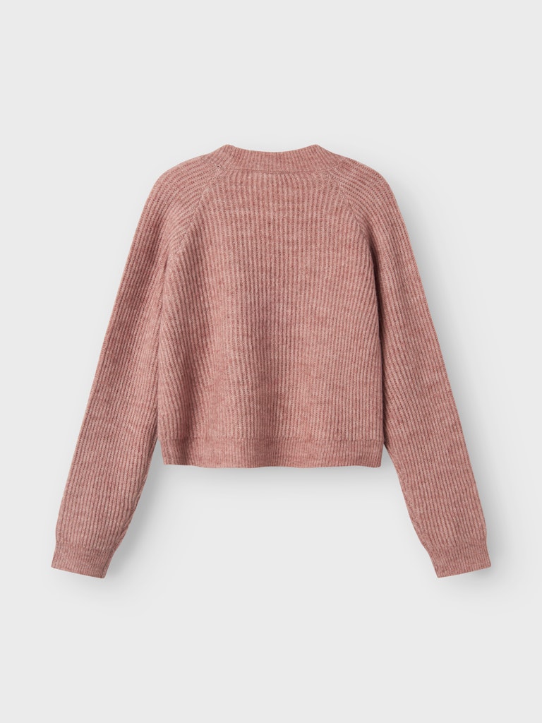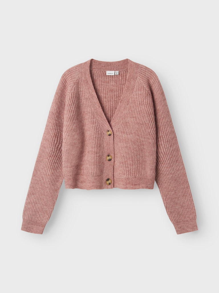 Πλεκτή ροζ ζακέτα NAME IT, σε rib υφή και cropped γραμμή, ιδανική για layering και καθημερινό στυλ.