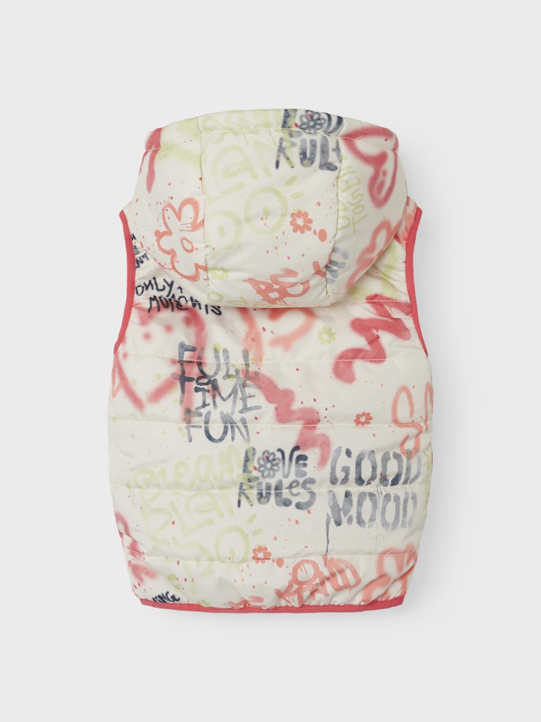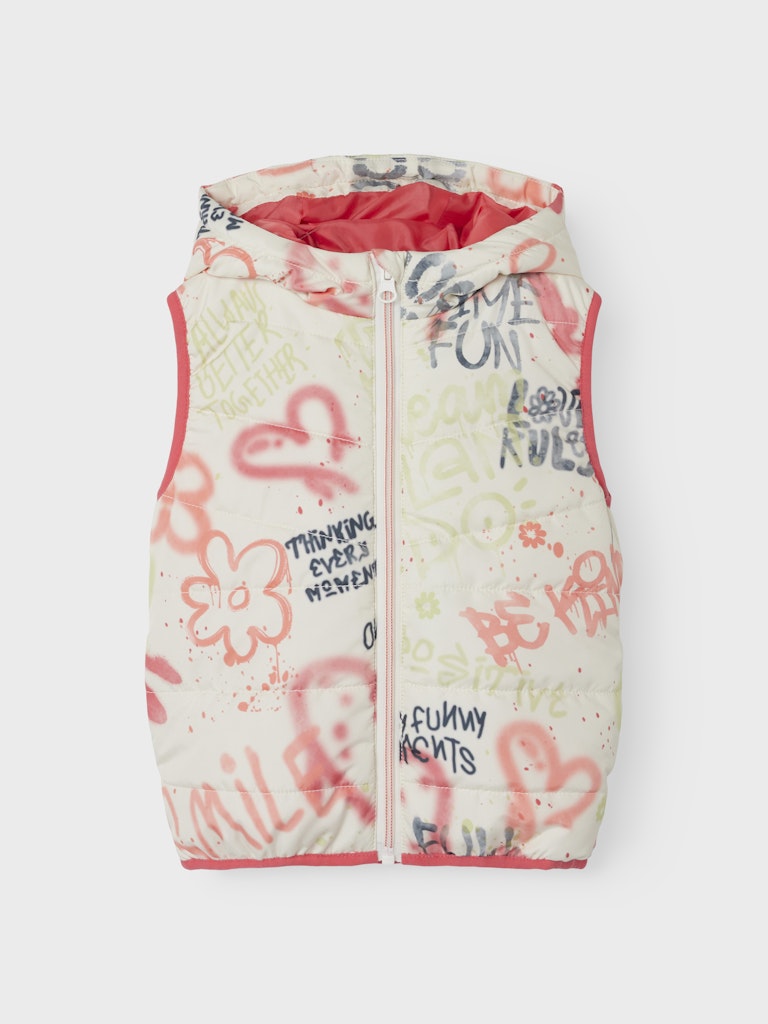 Παιδικό αμάνικο μπουφάν κοριτσιών NAME IT με πολύχρωμο γκράφιτι print και κουκούλα. Ιδανικό για φθινόπωρο και άνοιξη.