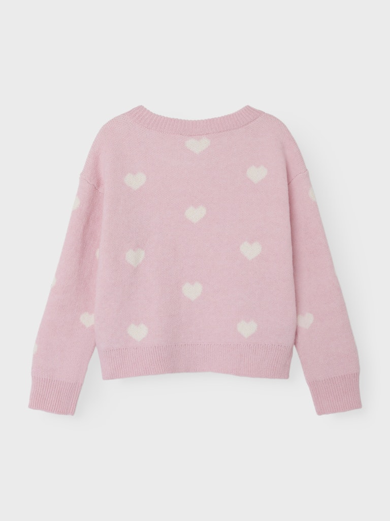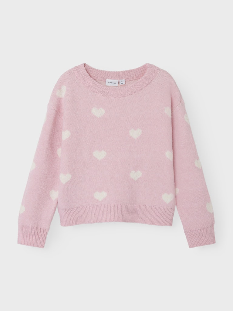 Παιδικό πλεκτό πουλόβερ NAME IT ροζ με καρδιές για κοριτσάκι. Ζεστό, μαλακό και ιδανικό για το σχολείο ή τη βόλτα.