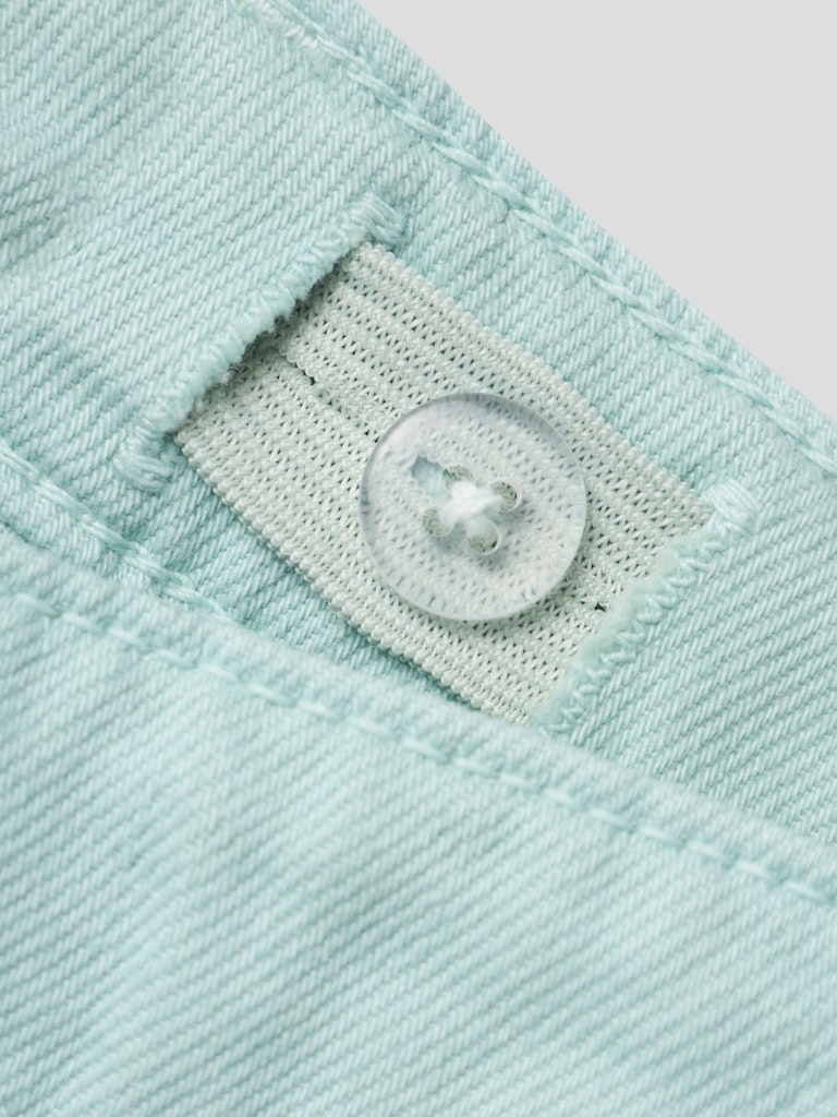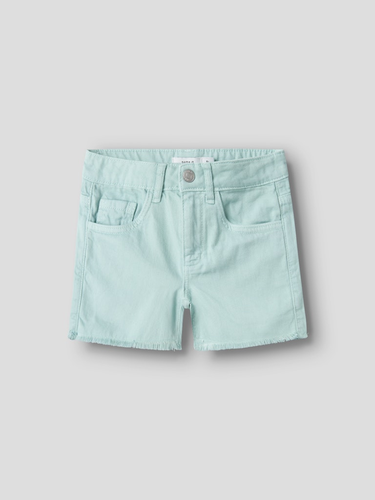 Παιδικό σορτσάκι τζιν ”NAME IT” για κορίτσια σε βεραμάν απόχρωση, με ξέφτια και ρυθμιζόμενη μέση – ιδανικό για καθημερινές καλοκαιρινές εμφανίσεις.