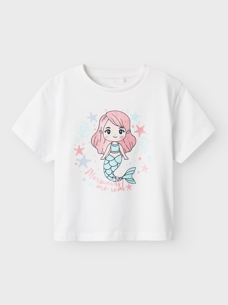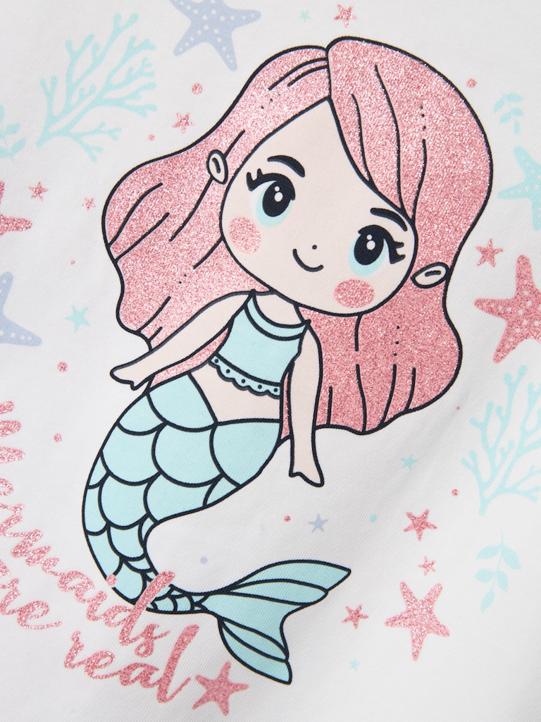 Λευκή παιδική μπλούζα ”NAME IT” με τύπωμα γοργόνας και ροζ glitter από οργανικό βαμβάκι