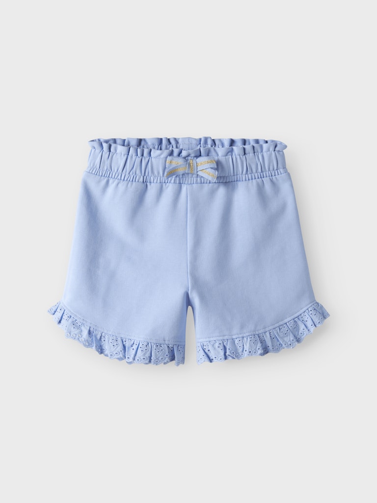Γαλάζιο παιδικό σορτς ”NAME IT” με φιογκάκι και βολάν για κορίτσια 1-7 ετών από οργανικό βαμβάκι. Άνετο και στιλάτο για το καλοκαίρι.
