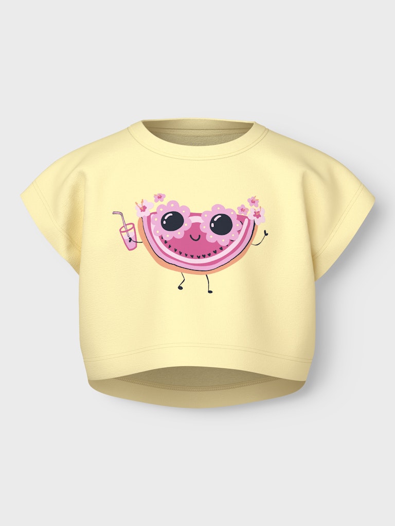 Παιδικό ροζ crop top ”NAME IT”. Print καρπούζι με γυαλιά και λουλούδια, για κορίτσια – ιδανικό για το καλοκαίρι.