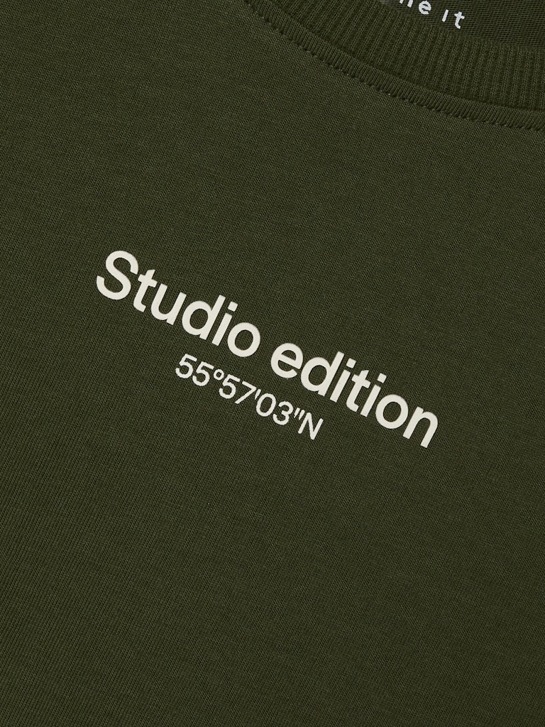 Χακί παιδικό t-shirt ”NAME IT” με print “Studio Edition” από 100% οργανικό βαμβάκι – ιδανικό για καθημερινές εμφανίσεις.