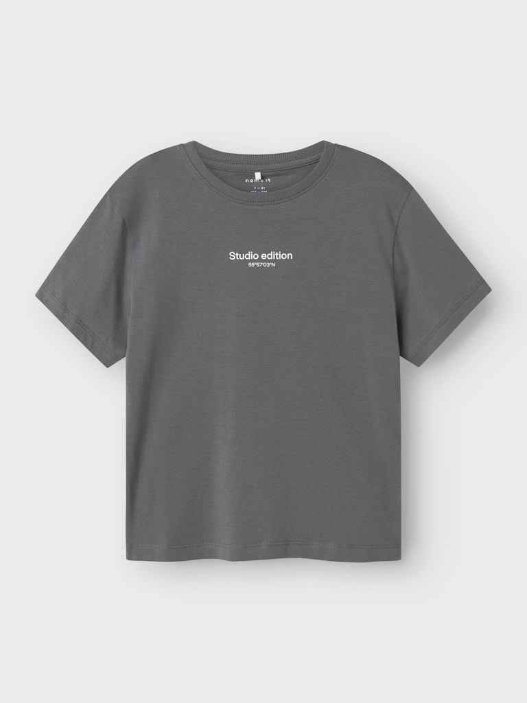 Γκρι ανθρακί παιδικό t-shirt ”NAME IT” με print “Studio Edition” από 100% οργανικό βαμβάκι – ιδανικό για καθημερινές εμφανίσεις.