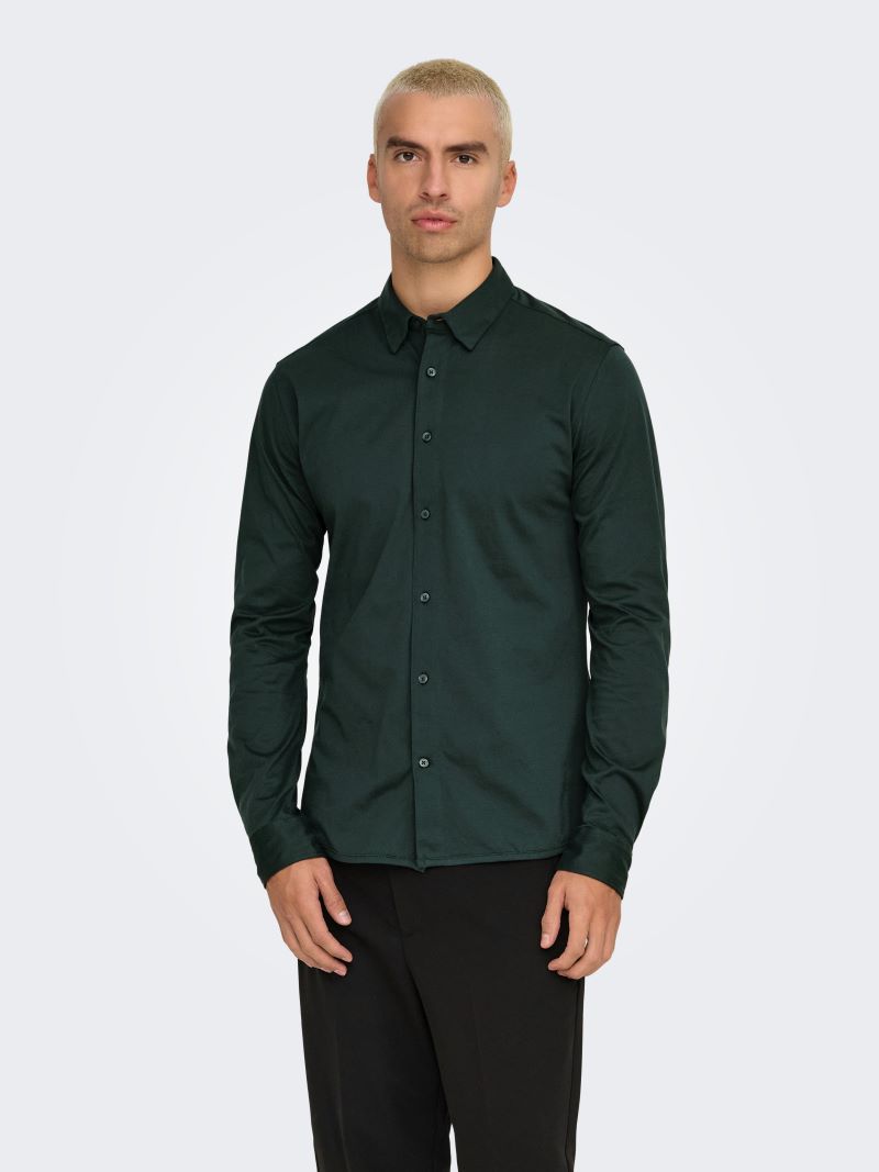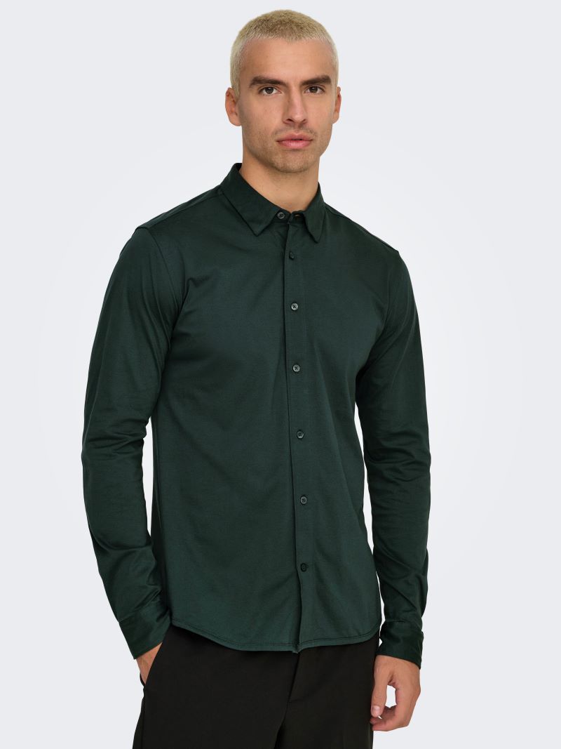 Ανδρικό πουκάμισο ONLY & SONS σε σκούρο πράσινο, ελαστικό με απαλή υφή και καθαρό σχεδιασμό, ιδανικό για smart καθημερινές εμφανίσεις.