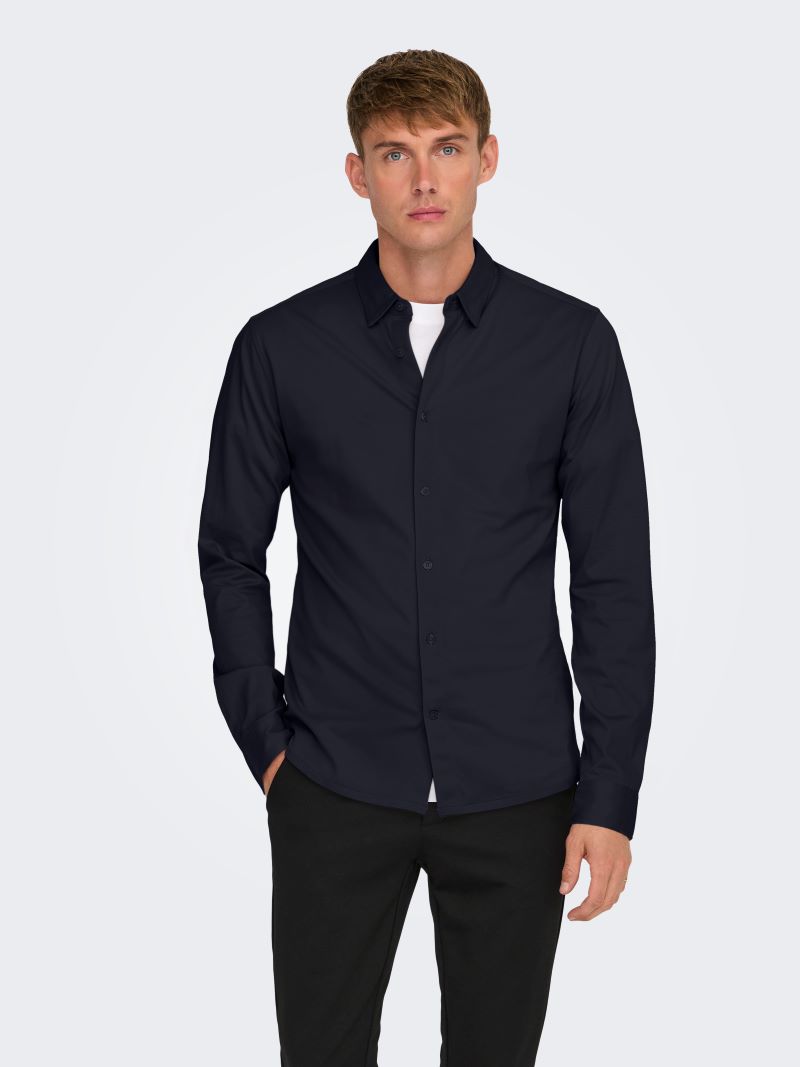 Ανδρικό πουκάμισο ONLY & SONS σε σκούρο μπλε, ελαστικό με απαλή υφή και καθαρό σχεδιασμό, ιδανικό για smart καθημερινές εμφανίσεις.
