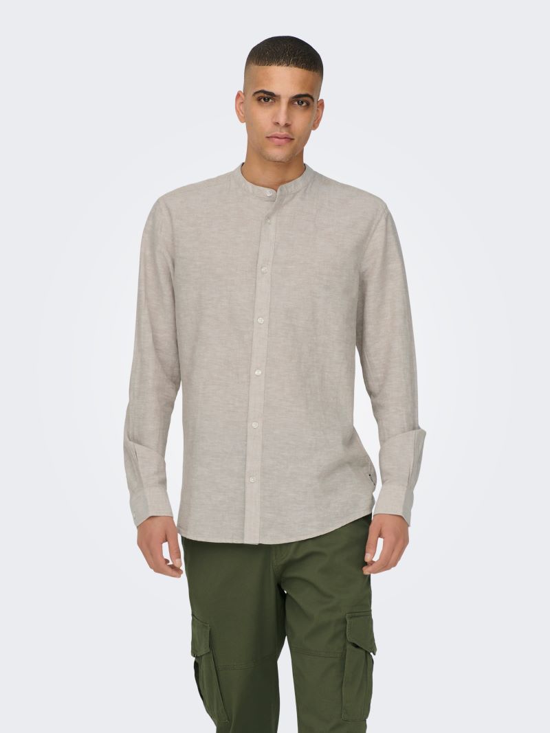 Μπεζ λινό πουκάμισο ONLY & SONS με mao γιακά και μακριά μανίκια – ιδανικό για smart καλοκαιρινές εμφανίσεις.
