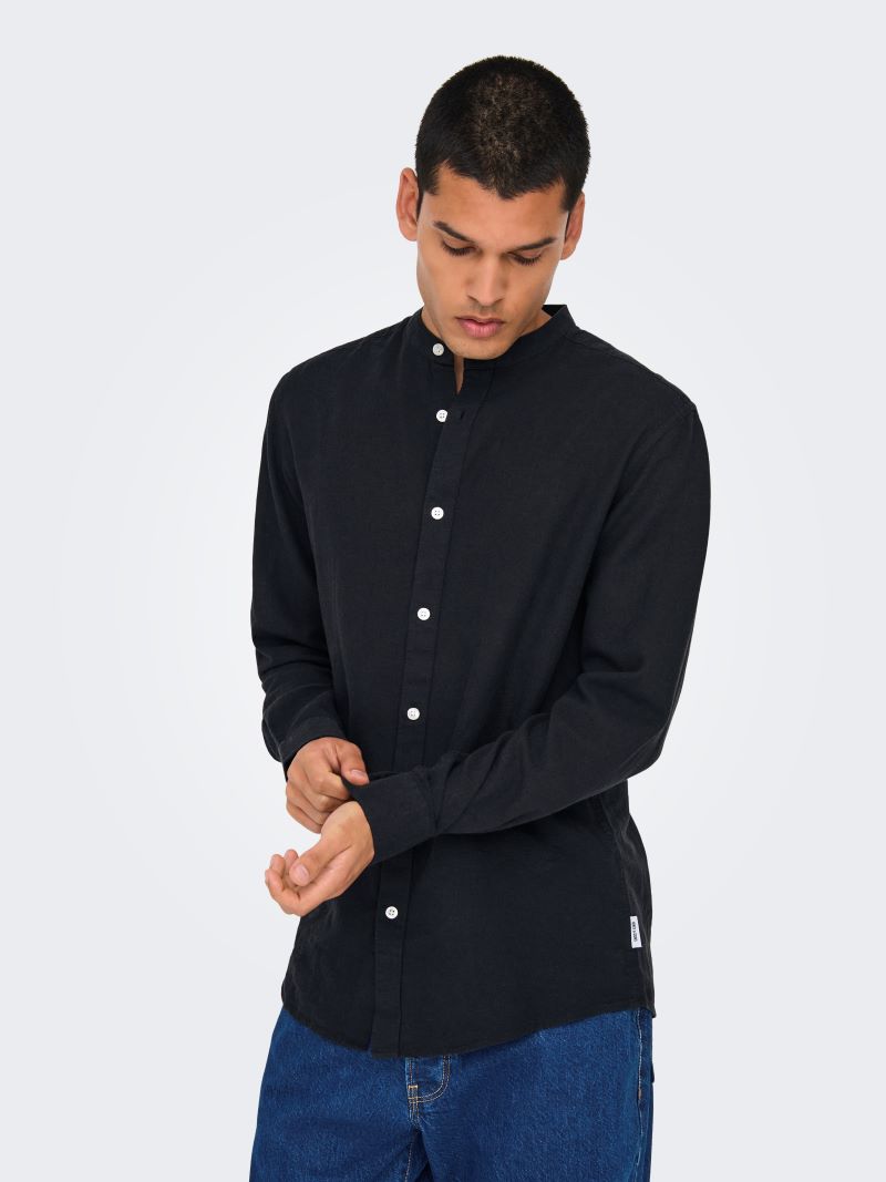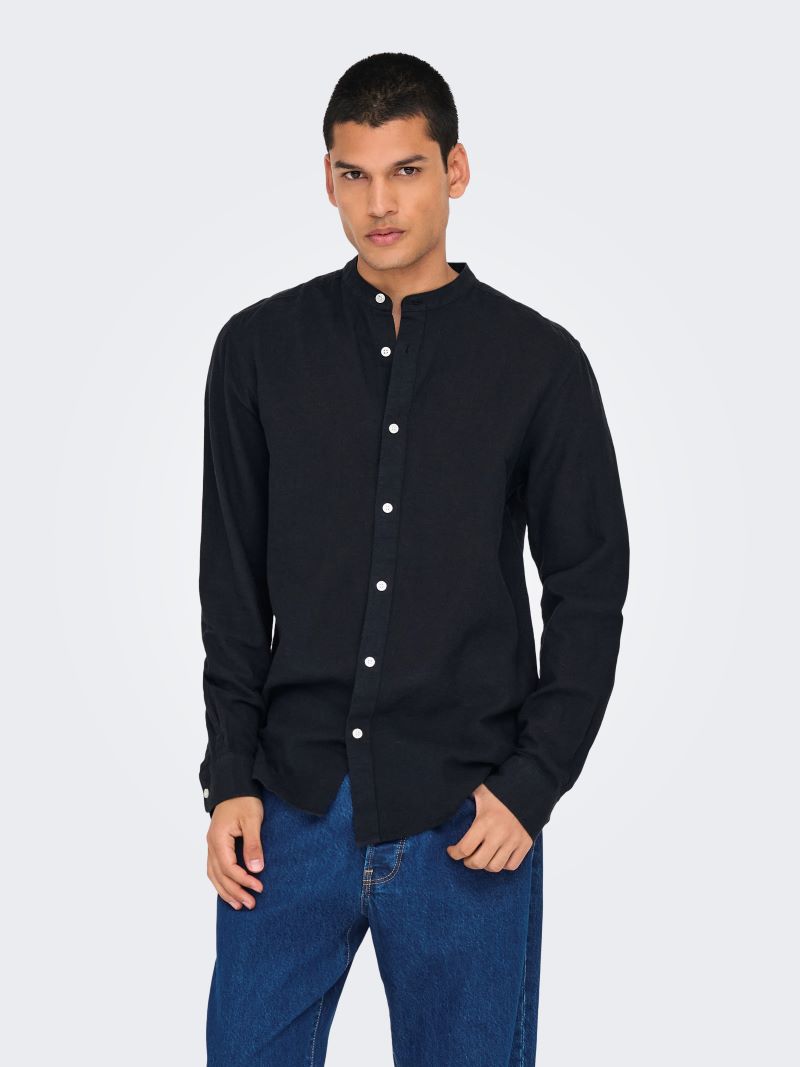Μαύρο λινό πουκάμισο ONLY & SONS με mao γιακά και μακριά μανίκια – ιδανικό για smart καλοκαιρινές εμφανίσεις.