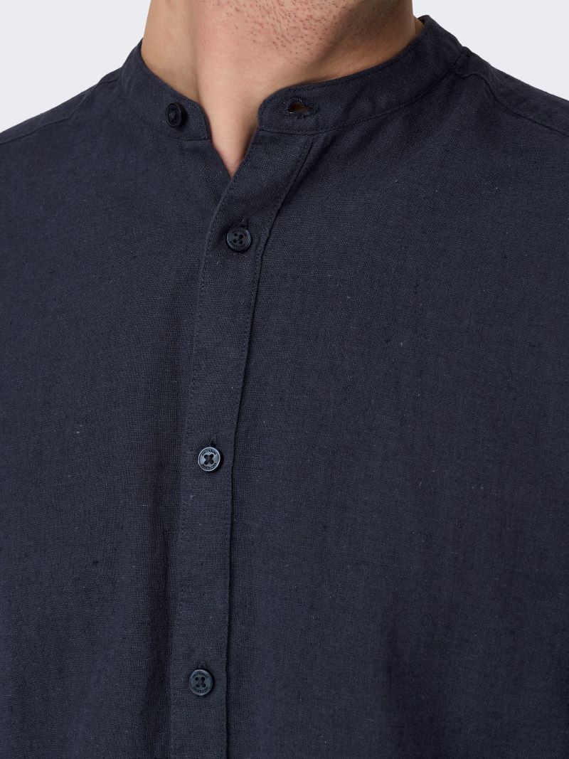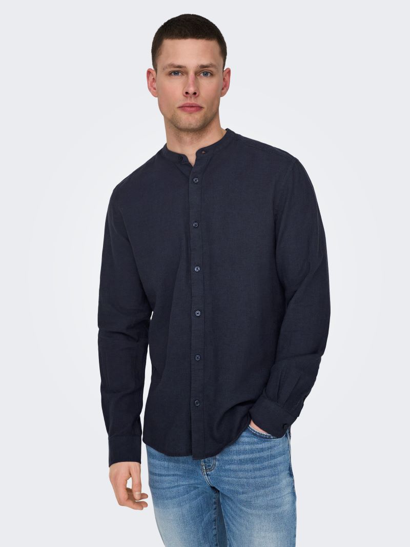 Σκούρο μπλε λινό πουκάμισο ONLY & SONS με mao γιακά και μακριά μανίκια – ιδανικό για smart καλοκαιρινές εμφανίσεις.