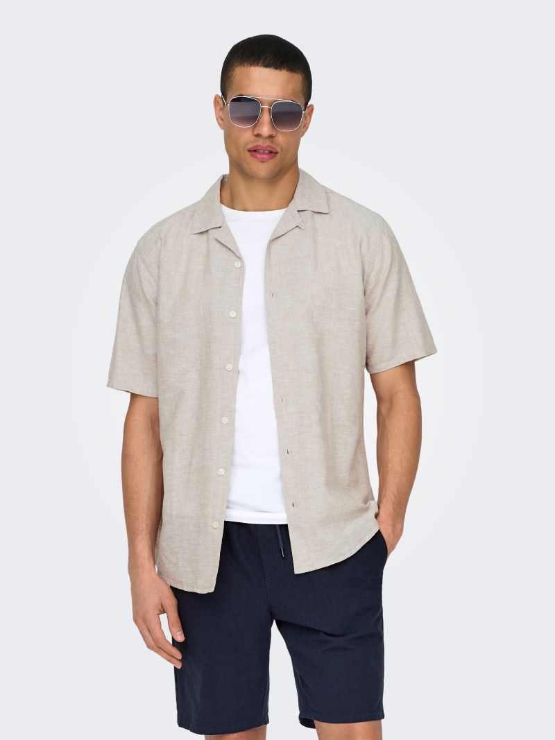 Ανδρικό μπεζ λινό πουκάμισο ONLY & SONS με κοντό μανίκι και ανοιχτό γιακά – ιδανικό για το καλοκαίρι.