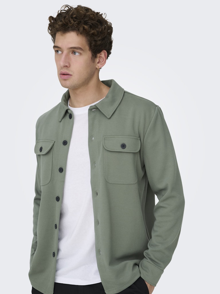 Ανδρικό overshirt ONLY & SONS σε χακί χρώμα με δύο τσέπες στο στήθος. Ιδανικό για layering και casual καθημερινά outfits με μοντέρνο urban στυλ.
