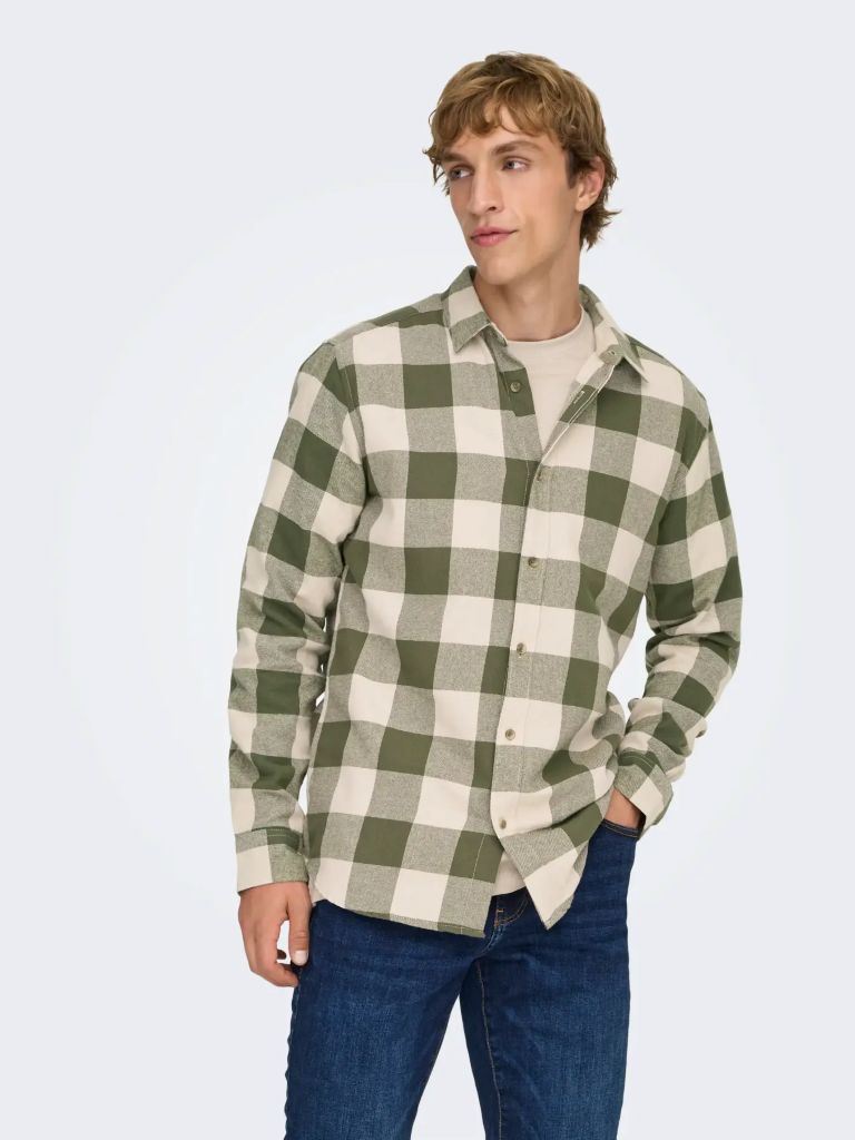 Ανδρικό καρό πουκάμισο ONLY & SONS σε μπεζ και λαδί χρώμα. Άνετη εφαρμογή και διαχρονικό casual στυλ για καθημερινά outfits.