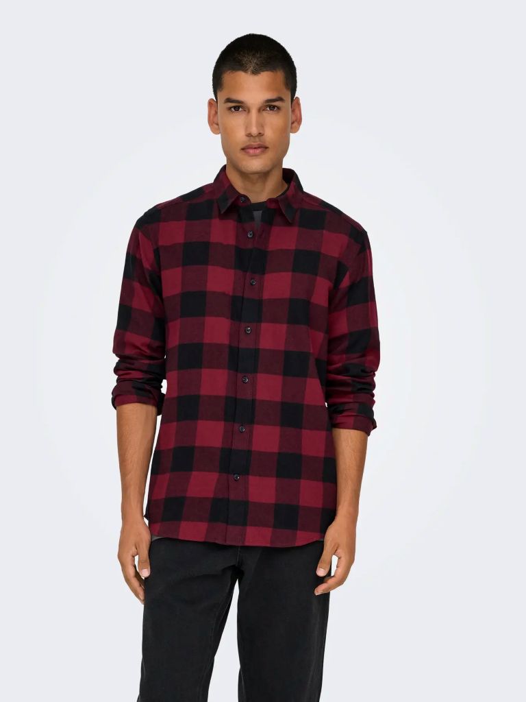 Ανδρικό καρό πουκάμισο ONLY & SONS σε κόκκινο και μαύρο χρώμα. Άνετη εφαρμογή και διαχρονικό casual στυλ για καθημερινά outfits.