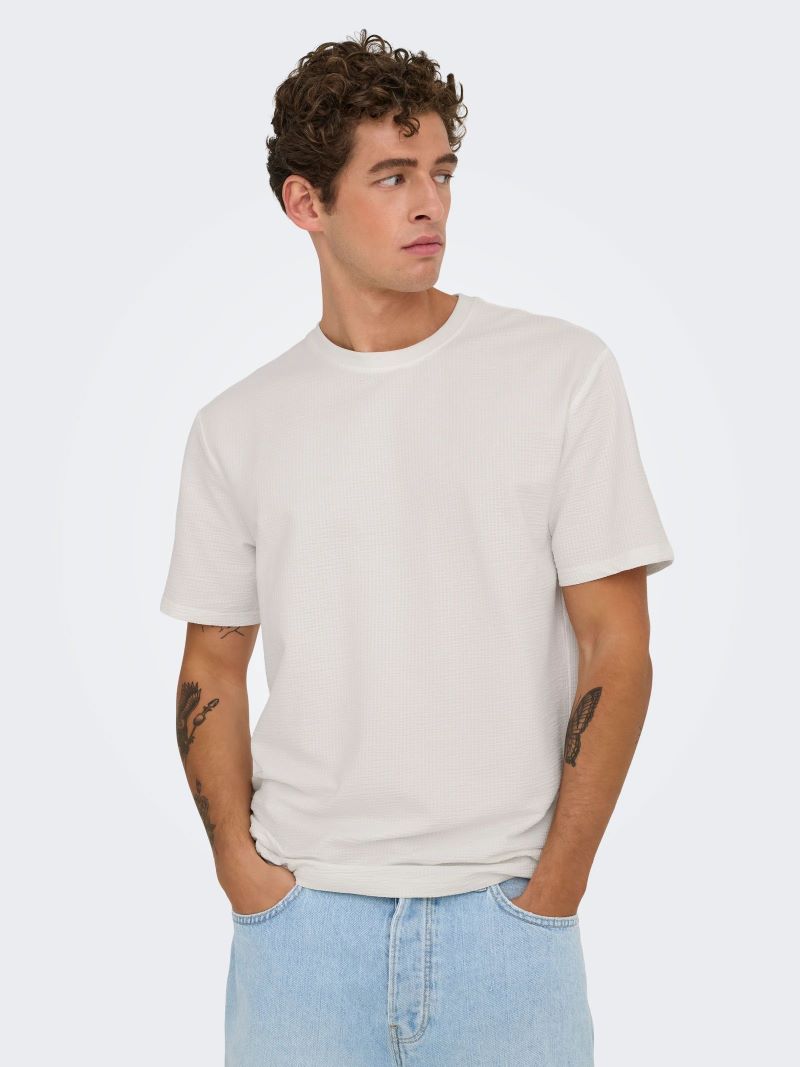 Ανδρικό t-shirt ONLY & SONS σε λευκό χρώμα με ανάγλυφη υφή υφάσματος. Minimal design και άνετη εφαρμογή για casual και smart casual εμφανίσεις.