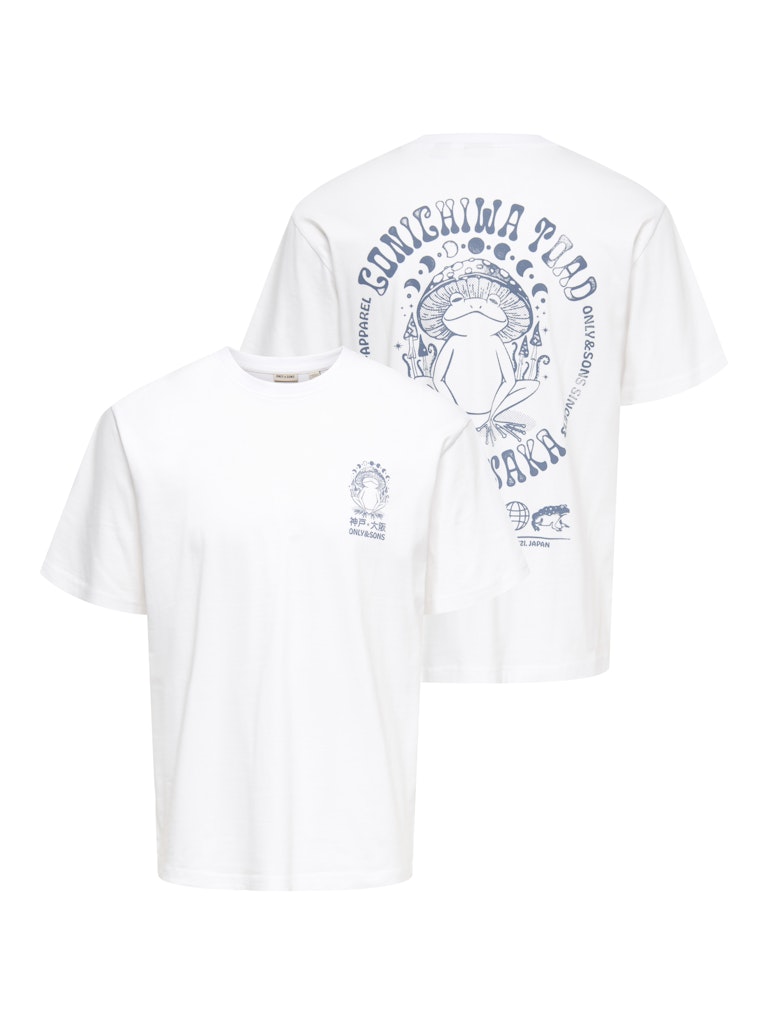 Ανδρικό t-shirt ONLY & SONS σε λευκό χρώμα με μικρό print μπροστά και μεγάλο graphic “Konichiwa Toad – Kobe Osaka” στην πλάτη. Ιδανικό για casual και street style εμφανίσεις.