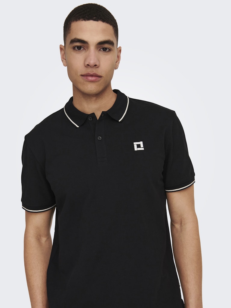 Ανδρικό polo μπλουζάκι ONLY & SONS σε μαύρο χρώμα με contrast λεπτομέρειες στον γιακά και στα μανίκια. Ιδανικό για casual και smart casual εμφανίσεις.