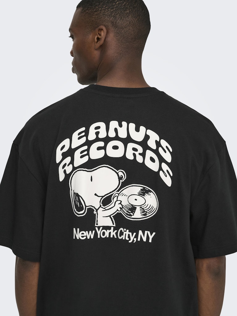Ανδρικό t-shirt ONLY & SONS μαύρο με Snoopy “Peanuts Records” print μπροστά και μεγάλο graphic στην πλάτη. Ιδανικό για casual και streetwear εμφανίσεις.