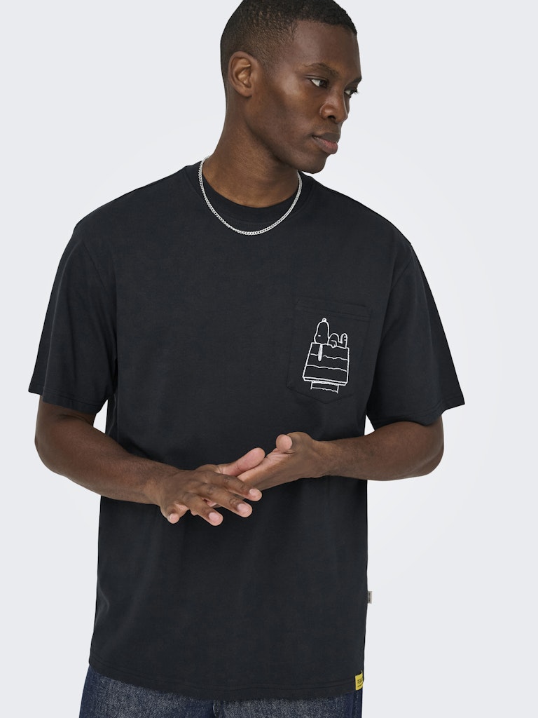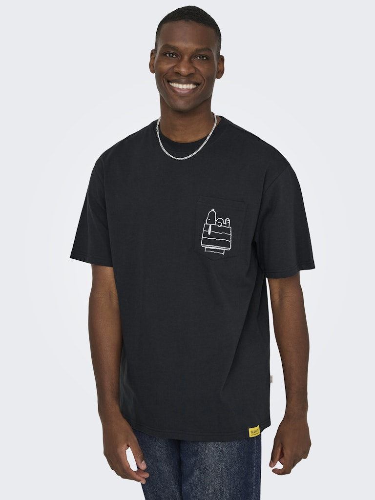 Ανδρικό t-shirt ONLY & SONS σε μαύρο χρώμα με τσέπη στο στήθος και Snoopy graphic. Άνετη εφαρμογή και μοντέρνο casual στυλ για καθημερινές εμφανίσεις.