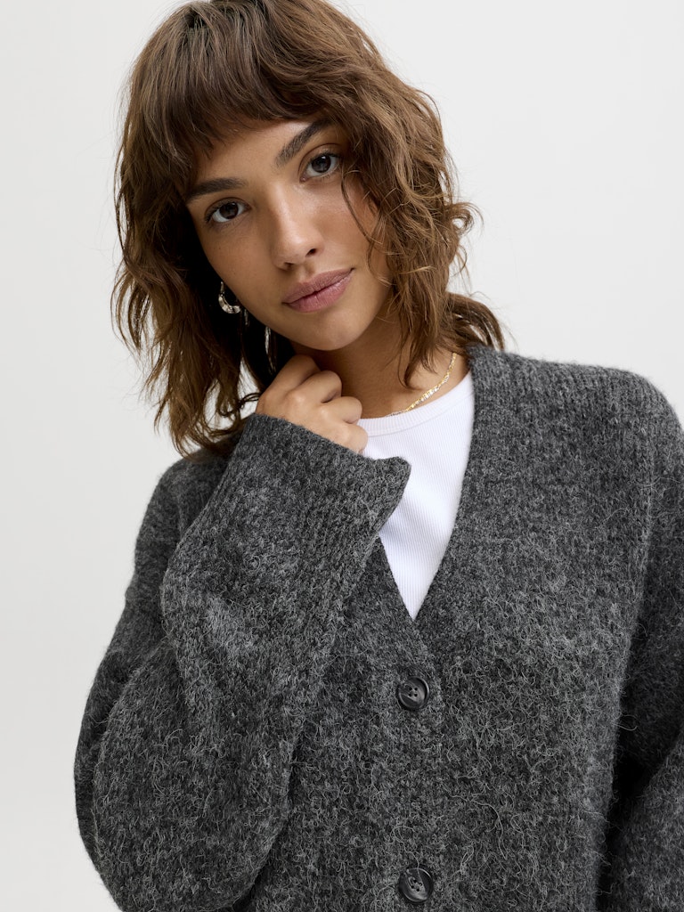 Γκρι πλεκτή ζακέτα JJXX με V λαιμόκοψη και κουμπιά, ιδανική για κομψά και ζεστά χειμερινά outfits.
