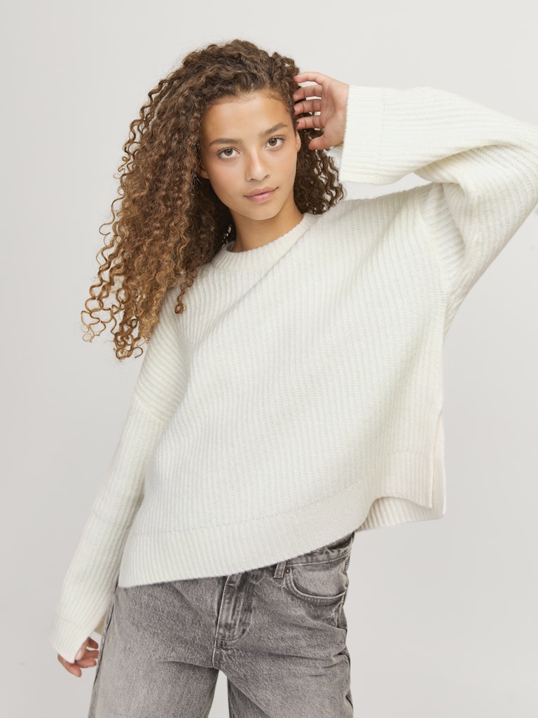 Λευκό πλεκτό πουλόβερ JJXX με rib πλέξη και φαρδιά μανίκια, ιδανικό για κομψά και minimal χειμερινά outfits.
