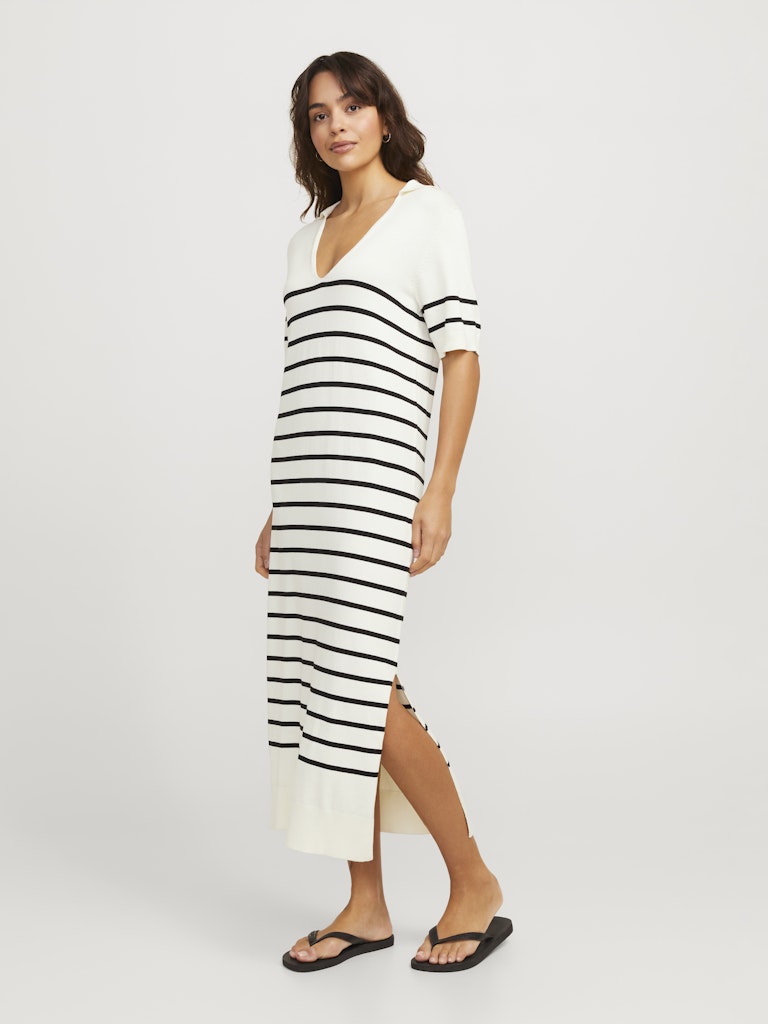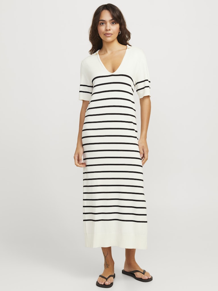 Πλεκτό μακρύ φόρεμα JJXX με γιακά, V λαιμόκοψη και ρίγες – άνετο, στιλάτο και ιδανικό για καλοκαιρινά city looks και διακοπές.