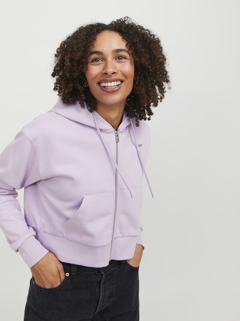 Λιλά cropped ζακέτα φούτερ JJXX με φερμουάρ και κουκούλα, ιδανική για athleisure και σύγχρονα casual outfits.