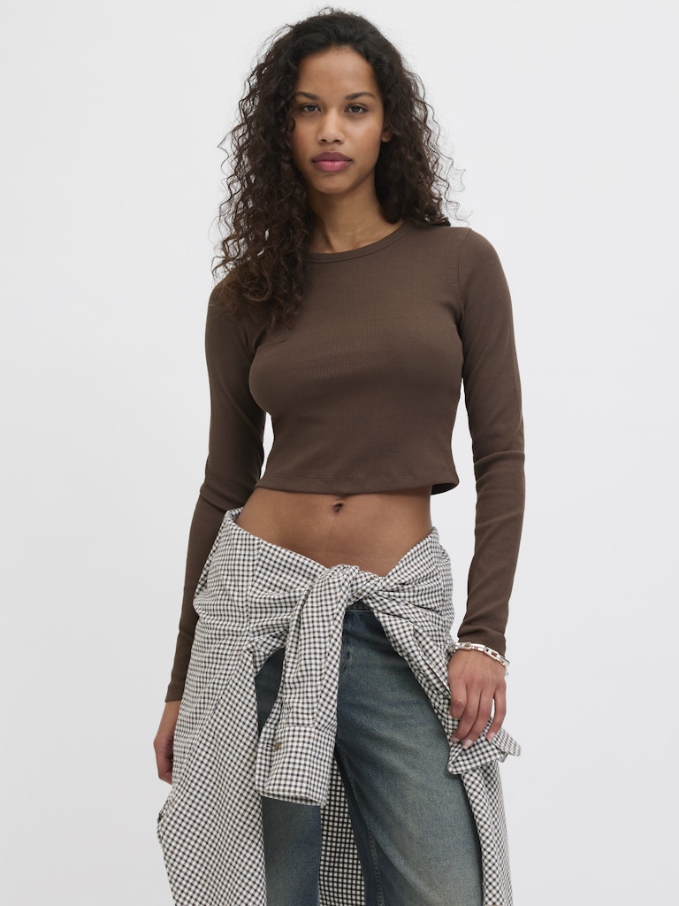 Καφέ cropped rib μπλούζα JJXX με εφαρμοστή γραμμή και μακρύ μανίκι, ιδανική για minimal και σύγχρονα καθημερινά outfits.
