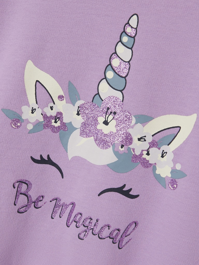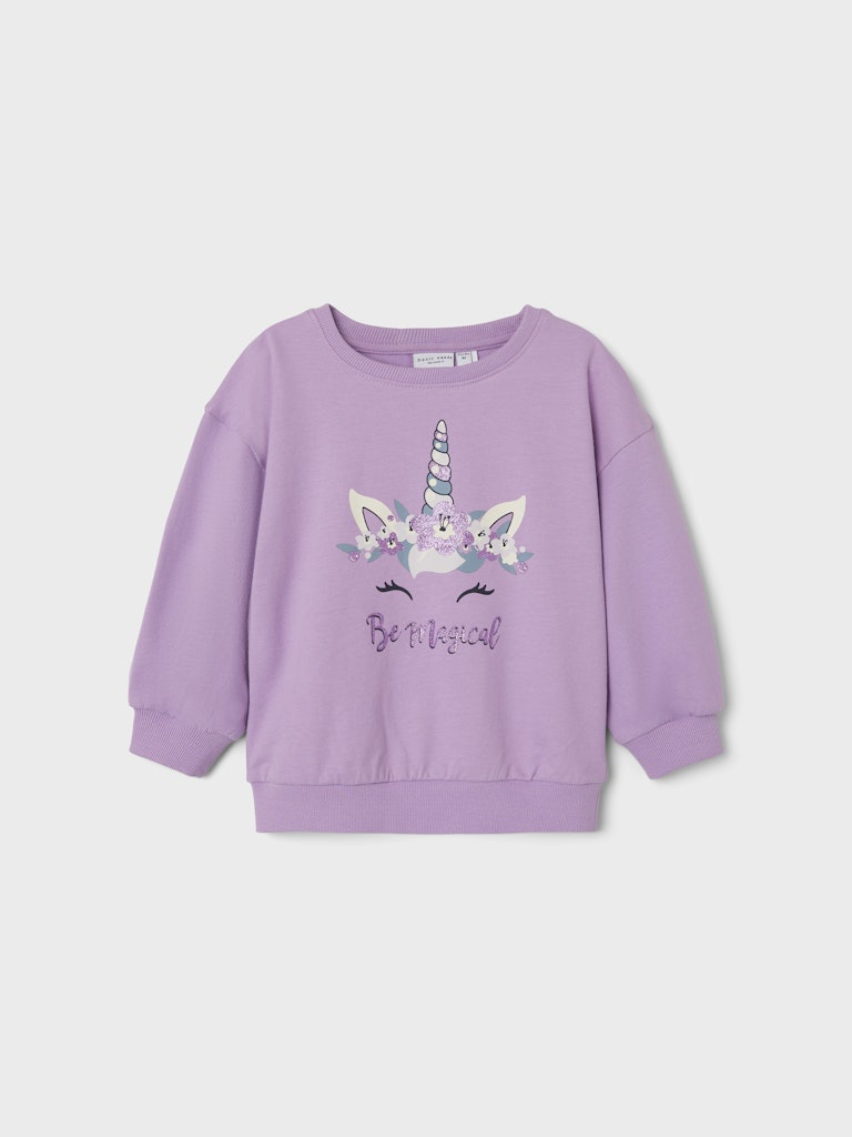 Παιδικό φούτερ NAME IT σε λιλά χρώμα με μονόκερο και glitter λεπτομέρειες. Άνετο και παιχνιδιάρικο, ιδανικό για καθημερινές εμφανίσεις.