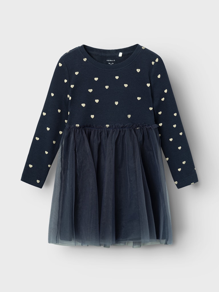 Παιδικό φόρεμα Name It με τούλι και χρυσές καρδούλες σε navy blue απόχρωση – ιδανικό για πάρτι και ιδιαίτερες εμφανίσεις.