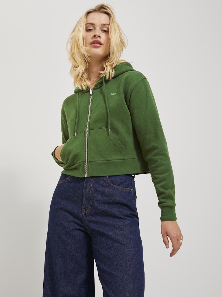 Πράσινη cropped ζακέτα φούτερ JJXX με φερμουάρ και κουκούλα, ιδανική για athleisure και σύγχρονα casual outfits.