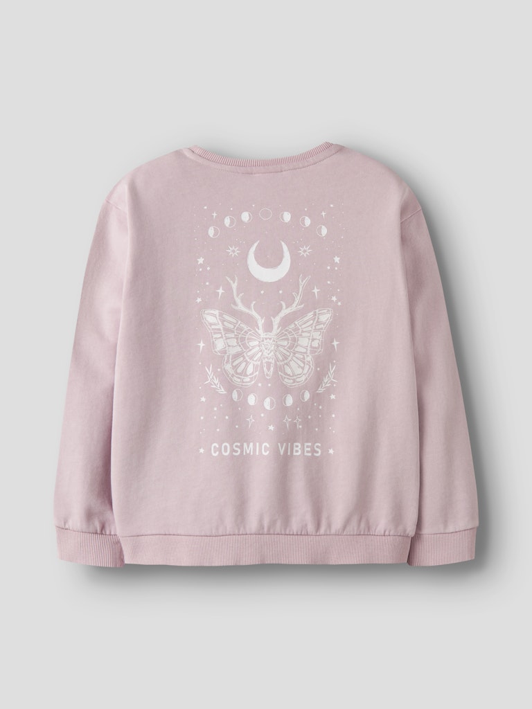 Ροζ ξεβαμμένο φούτερ για κορίτσια με glitter print “Cosmic Vibes”, από οργανικό βαμβάκι και χωρίς χνούδι εσωτερικά. Ιδανικό για καθημερινά looks.