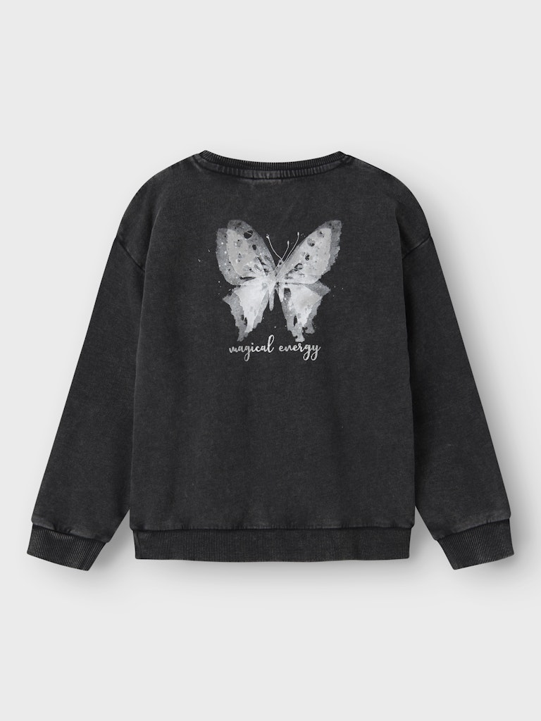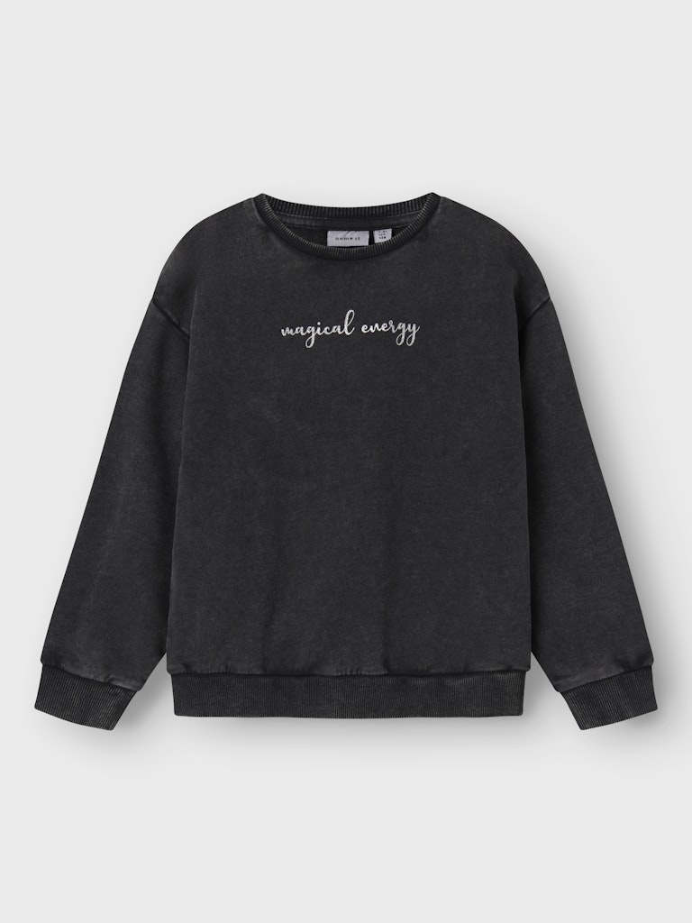Μαύρο ξεβαμμένο φούτερ για κορίτσια με glitter print “Magical energy”, από οργανικό βαμβάκι και χωρίς χνούδι εσωτερικά. Ιδανικό για καθημερινά looks.