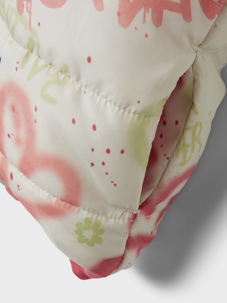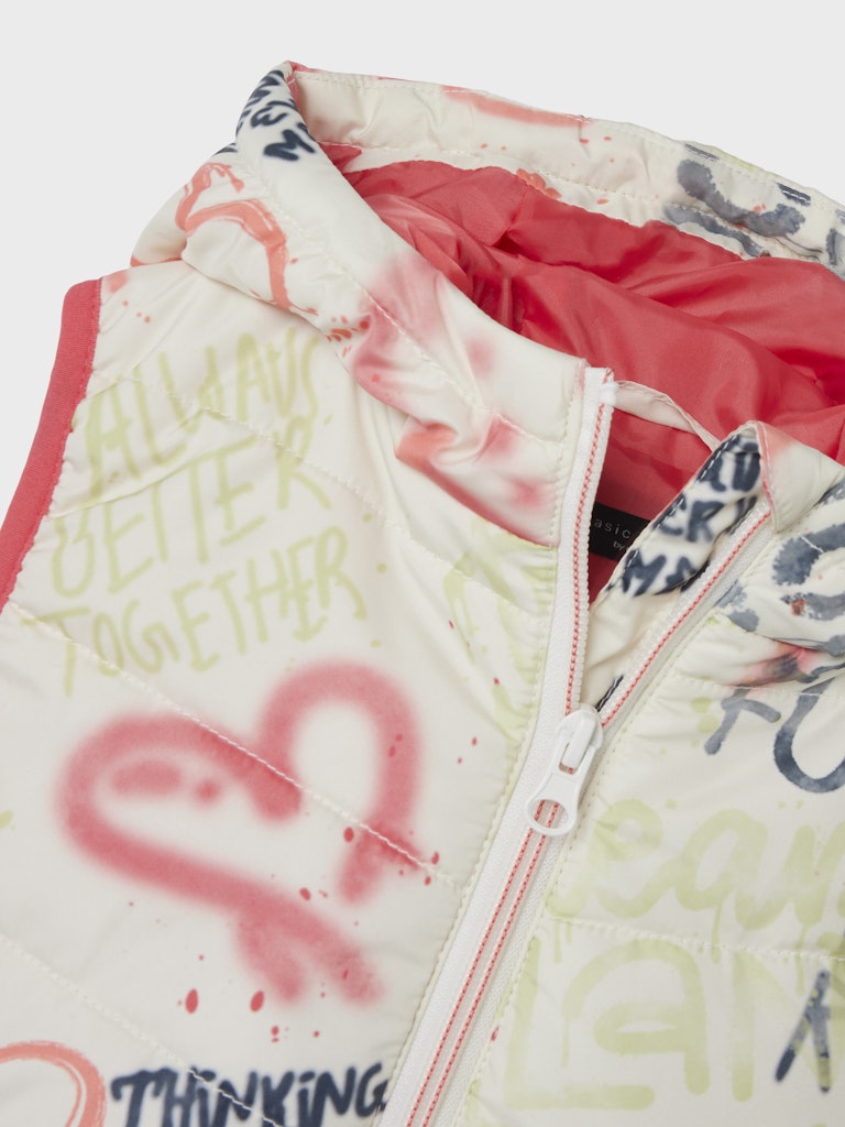 Μοντέρνο, παιχνιδιάρικο και super άνετο, αυτό το αμάνικο μπουφάν της NAME IT είναι ό,τι χρειάζεται κάθε μικρή fashionista για τις πρώτες φθινοπωρινές και ανοιξιάτικες βόλτες. Το πολύχρωμο γκράφιτι print του σε συνδυασμό με τις φράσεις “Thinking every moment” και “Smile” προσφέρει μια δυναμική street style αισθητική, ενώ η απαλή επένδυση εξασφαλίζει άνεση και ζεστασιά χωρίς βάρος.