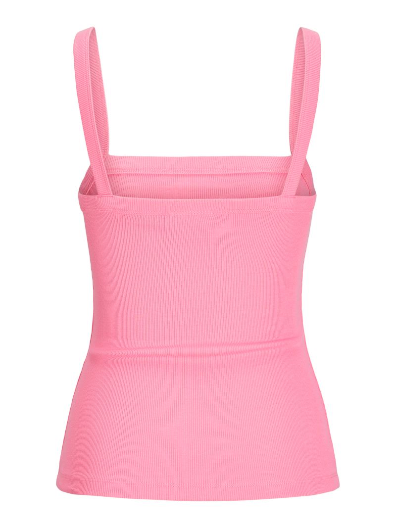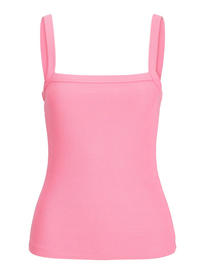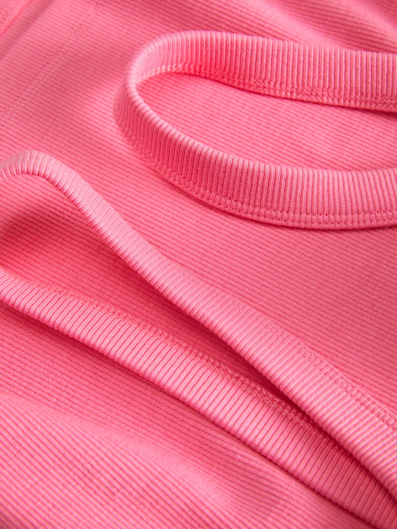 Ροζ ribbed ραντάκι με τετράγωνη λαιμόκοψη και φαρδιές τιράντες, από ελαστικό βαμβακερό ύφασμα. Εφαρμοστή γραμμή που αγκαλιάζει το σώμα, ιδανικό για καθημερινές και καλοκαιρινές εμφανίσεις.