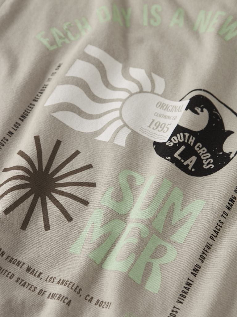 Σε μπεζ washed απόχρωση για πιο ιδιαίτερο look, διαθέτει minimal print μπροστά και εντυπωσιακό graphic στην πλάτη με summer-inspired σχέδια και typography. Το μαλακό ύφασμα και η άνετη γραμμή το κάνουν τέλειο για κάθε μέρα, από το σχολείο μέχρι τις βόλτες.