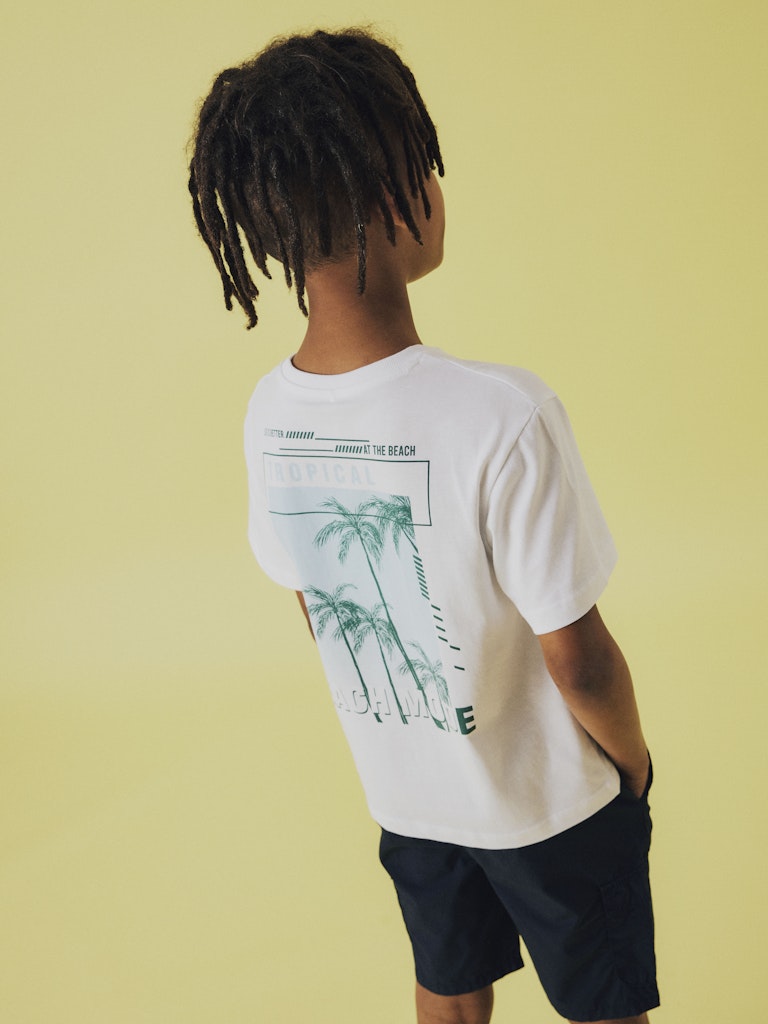 Το απόλυτο t-shirt για μικρούς… καλοκαιρινούς εξερευνητές! Με φόντο το λευκό και καλοκαιρινό print με φοίνικες στην πλάτη, αυτό το t-shirt αποπνέει surf vibes και beach attitude. Άνετο, δροσερό και έτοιμο για κάθε καλοκαιρινή περιπέτεια!