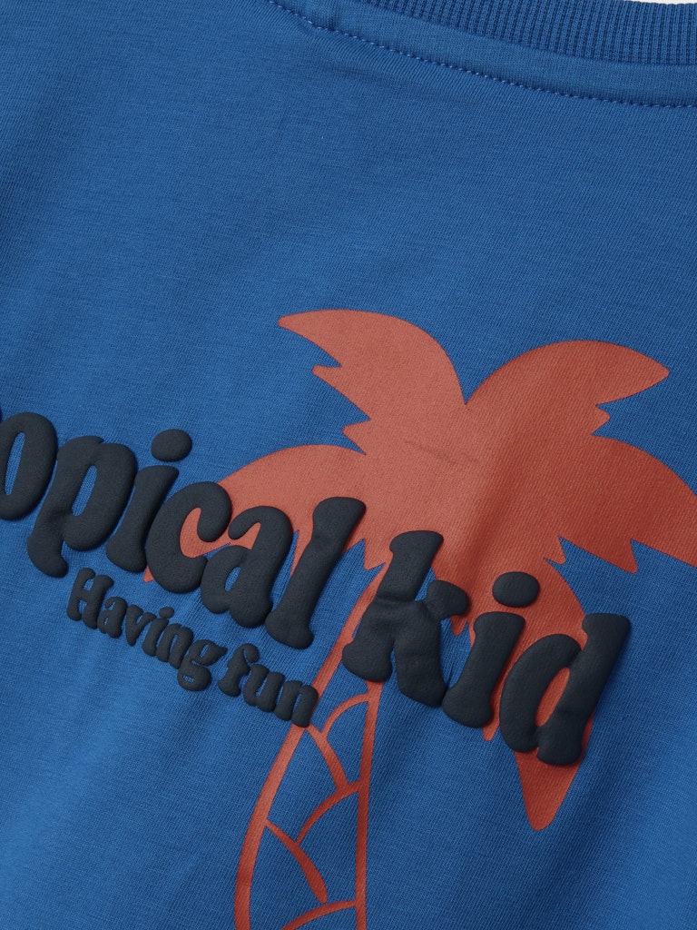 Ένα παιχνιδιάρικο t-shirt που φέρνει το καλοκαίρι πιο κοντά! Το μπλε μπλουζάκι “Tropical Kid” της NAME IT συνδυάζει έντονα χρώματα και ανάγλυφη στάμπα με φοίνικα, ιδανικό για ατελείωτο παιχνίδι και καλοκαιρινές περιπέτειες.